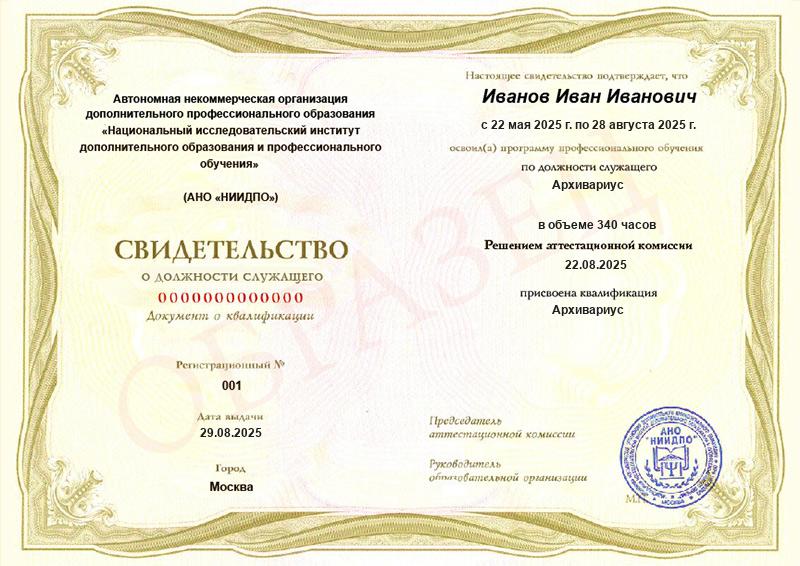 • Свидетельство о профессиональном обучении с присвоением квалификации архивариуса