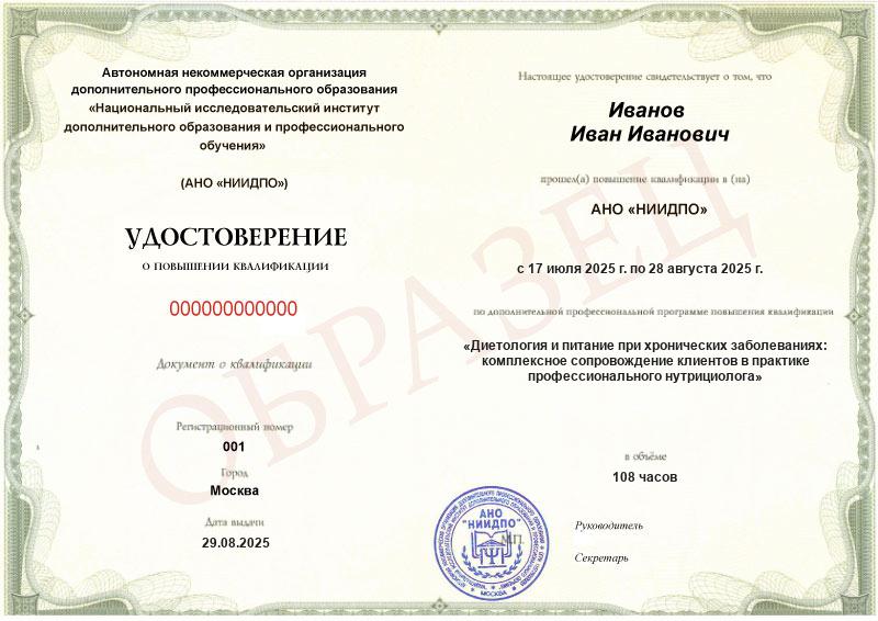 Диетология и питание при хронических заболеваниях: комплексное сопровождение клиентов в практике профессионального нутрициолога (108ч)