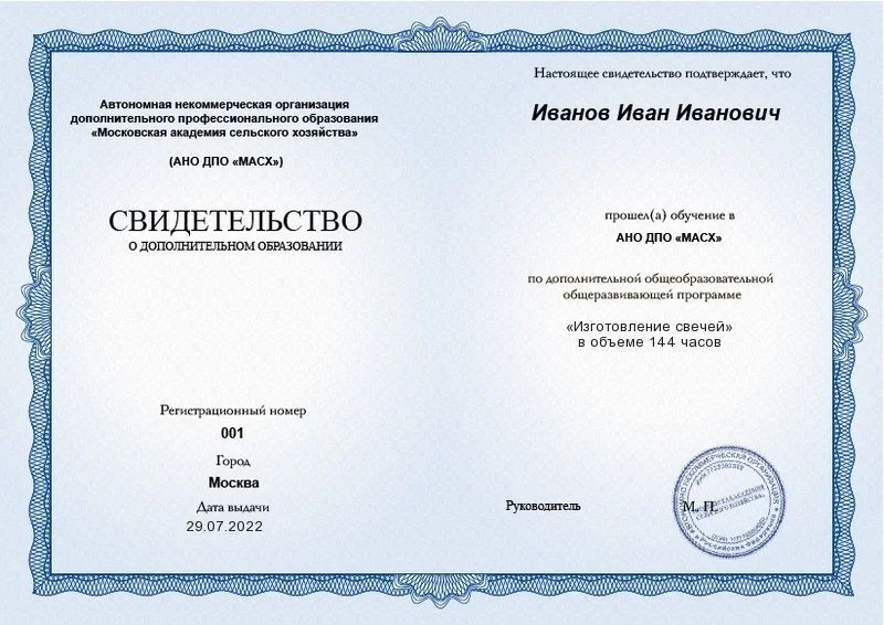 Свидетельство о дополнительном образовании. Вышлем его на вашу электронную почту в течение 14 рабочих дней после окончания обучения.