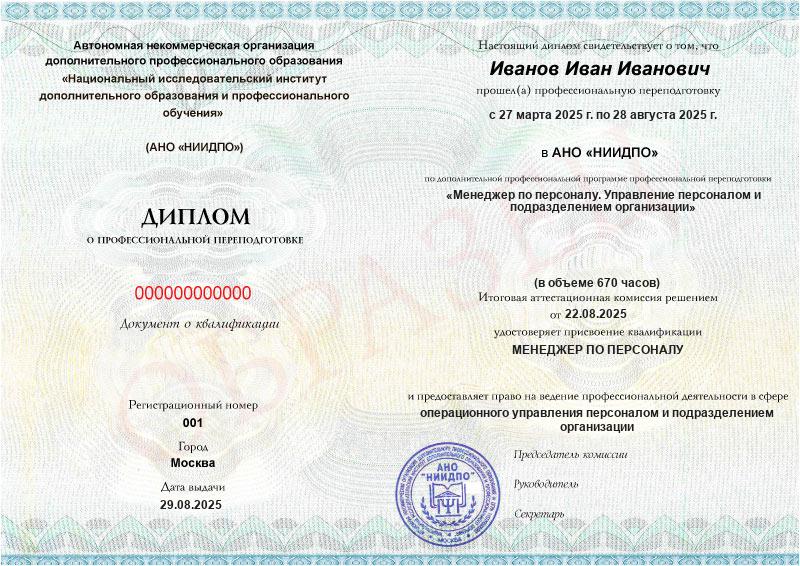 - Диплом о профессиональной переподготовке с квалификацией менеджера по персоналу
