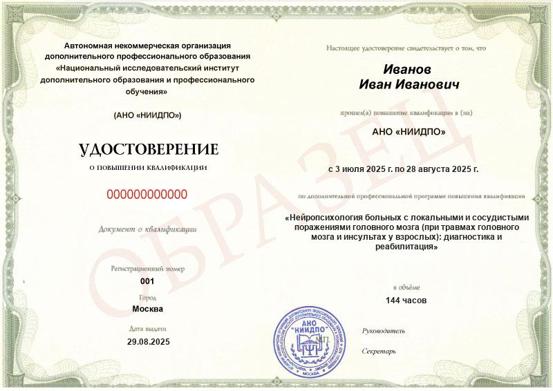 Нейропсихология больных с локальными и сосудистыми поражениями головного мозга (при травмах головного мозга и инсультах у взрослых): диагностика и реабилитация (144ч)