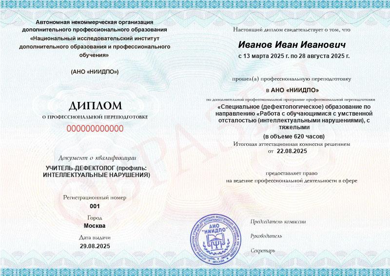 Специальное (дефектологическое) образование по направлению «Работа с обучающимися с умственной отсталостью (интеллектуальными нарушениями), с тяжелыми и множественными нарушениями развития». Олигофренопедагогика и олигофренопсихология (620ч)