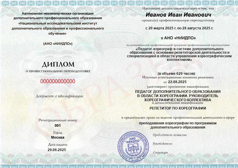 - 2 квалификации: Педагог дополнительного образования в области хореографии. Руководитель хореографического коллектива + Репетитор по хореографии