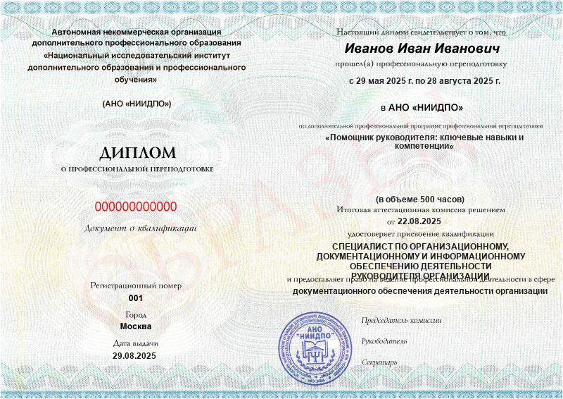 - Квалификация: Специалист по организационному, документационному и информационному обеспечению деятельности руководителя организации