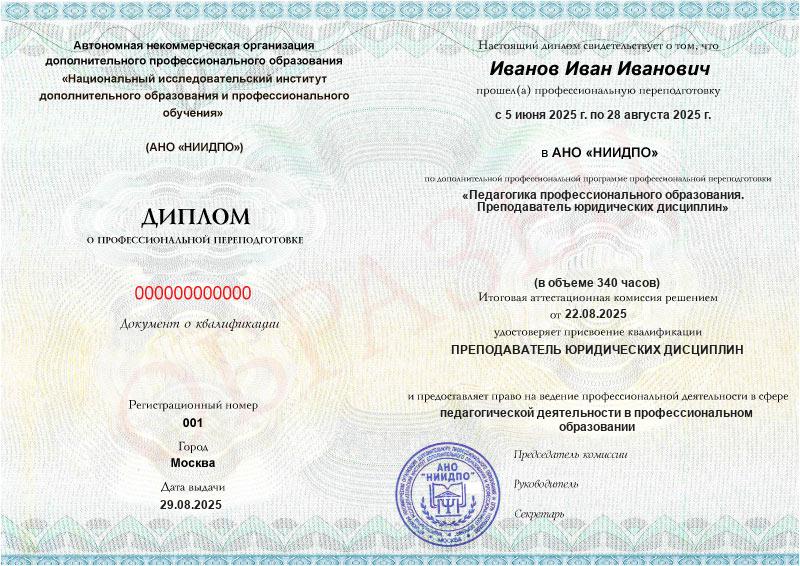 Обзор программы профессиональной переподготовки «Педагогика профессионального образования. Преподаватель юридических дисциплин» с присвоением квалификации «Преподаватель юридических дисциплин»