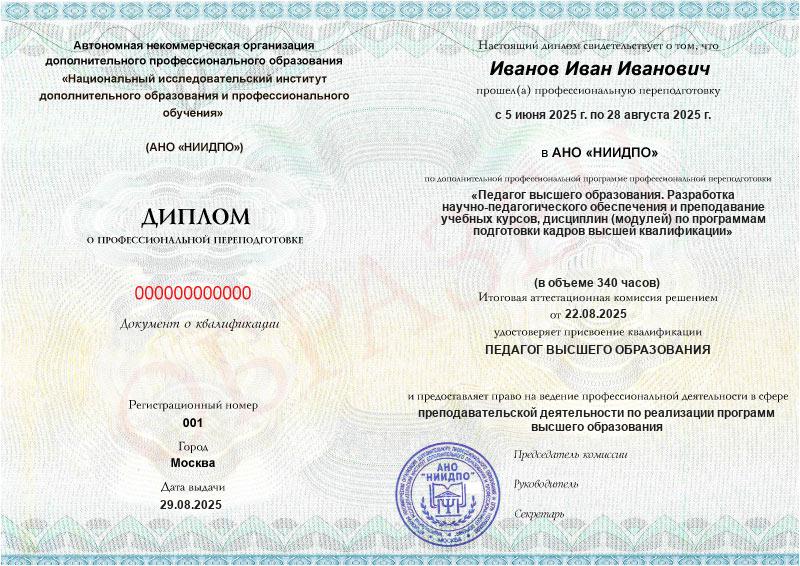 Педагог высшего образования. Разработка научно-педагогического обеспечения и преподавание учебных курсов, дисциплин (модулей) по программам подготовки кадров высшей квалификации (340ч)