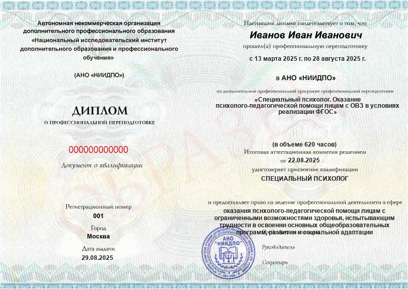 - любое ВО и диплом о профпереподготовке по психологии, специальному (дефектологическому) образованию в объеме не менее 500 ч.