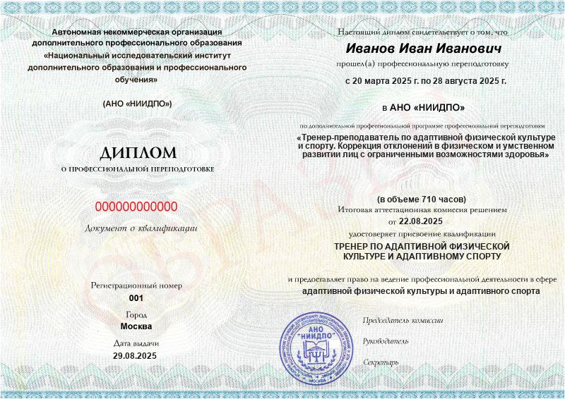 Тренер-преподаватель по адаптивной физической культуре и спорту. Коррекция отклонений в физическом и умственном развитии лиц с ограниченными возможностями здоровья (710ч)